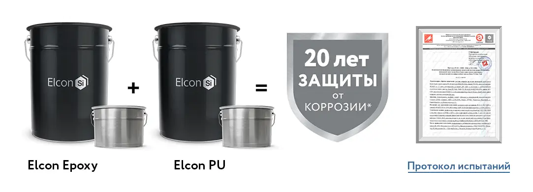Согласно климатическим испытаниям, проведенным в ООО НПО «Лакокраспокрытие», предполагаемый срок службы системы покрытия на основе эпоксидной грунт-эмали Elcon Epoxy в сочетании с полиуретановой атмосферостойкой эмалью Elcon PU составляет 20 лет.