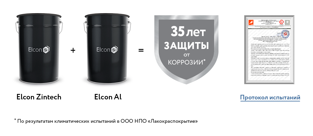 Отсутствие «белой коррозии» на поверхности Elcon Zintech, позволяет использование материала без перекрытия верхними слоями, т.е. получаем покрытие типа: грунт-эмаль. Грунтовочные покрытия на цинковой пыли обязательно должны перекрываться верхними слоями.